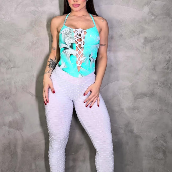 Stand out effortlessly in the Scrunch Booty White Wave and Light Green Print Jumpsuit. Its fresh white wave pattern paired with vibrant light green prints creates a dynamic, eye-catching look. The scrunch booty design enhances your natural curves, offering a flattering and confident fit. Perfect for any occasion where you want to blend comfort with bold style, this jumpsuit is a must-have for your wardrobe.